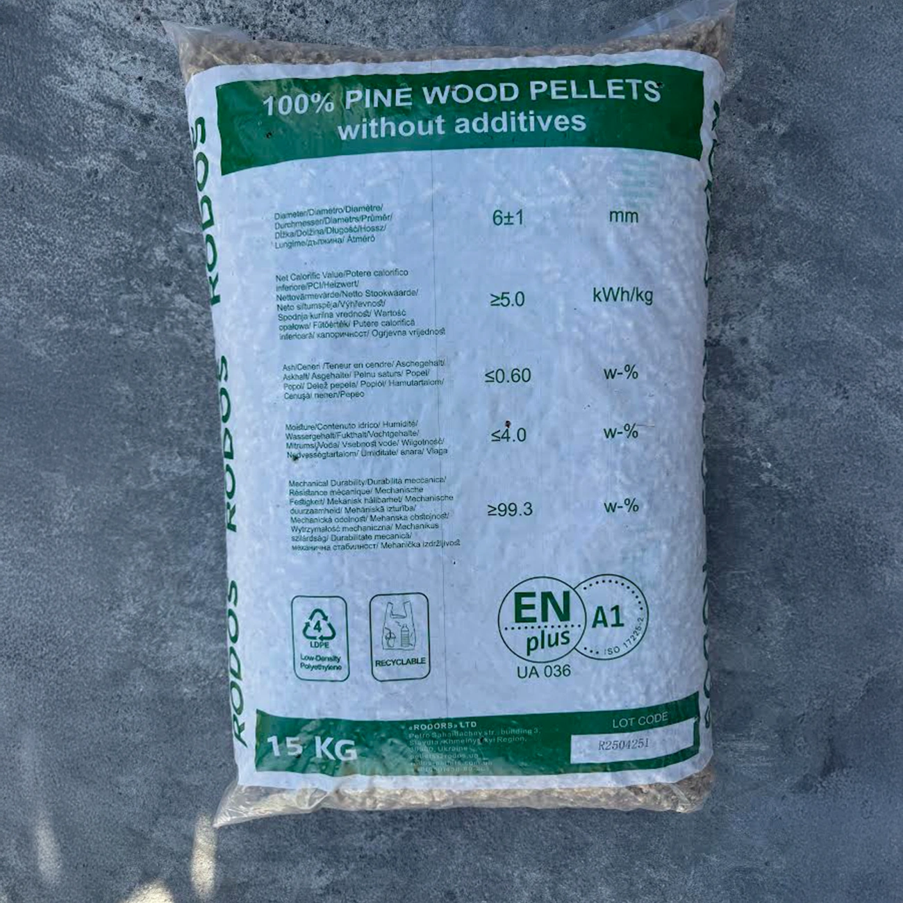Peleți rășinoase din rumeguș de pin Rodos – 15 kg, certificați ENplus A1